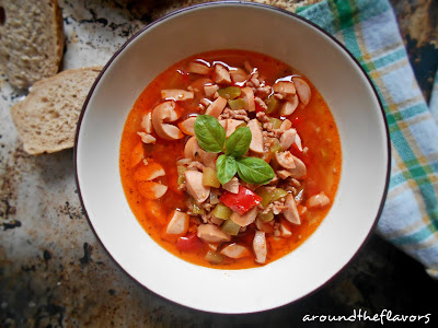 Całość podlej wodą,tak aby wszystko zakryła. Doprowadź do wrzenia,dodaj kostkę i koncentrat pomidorowy. Dopraw do smaku.