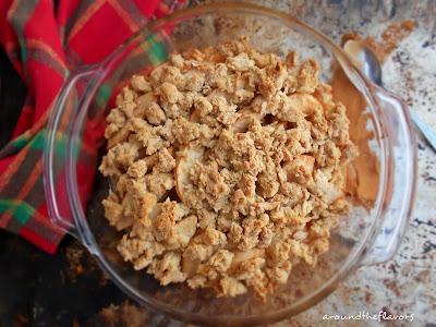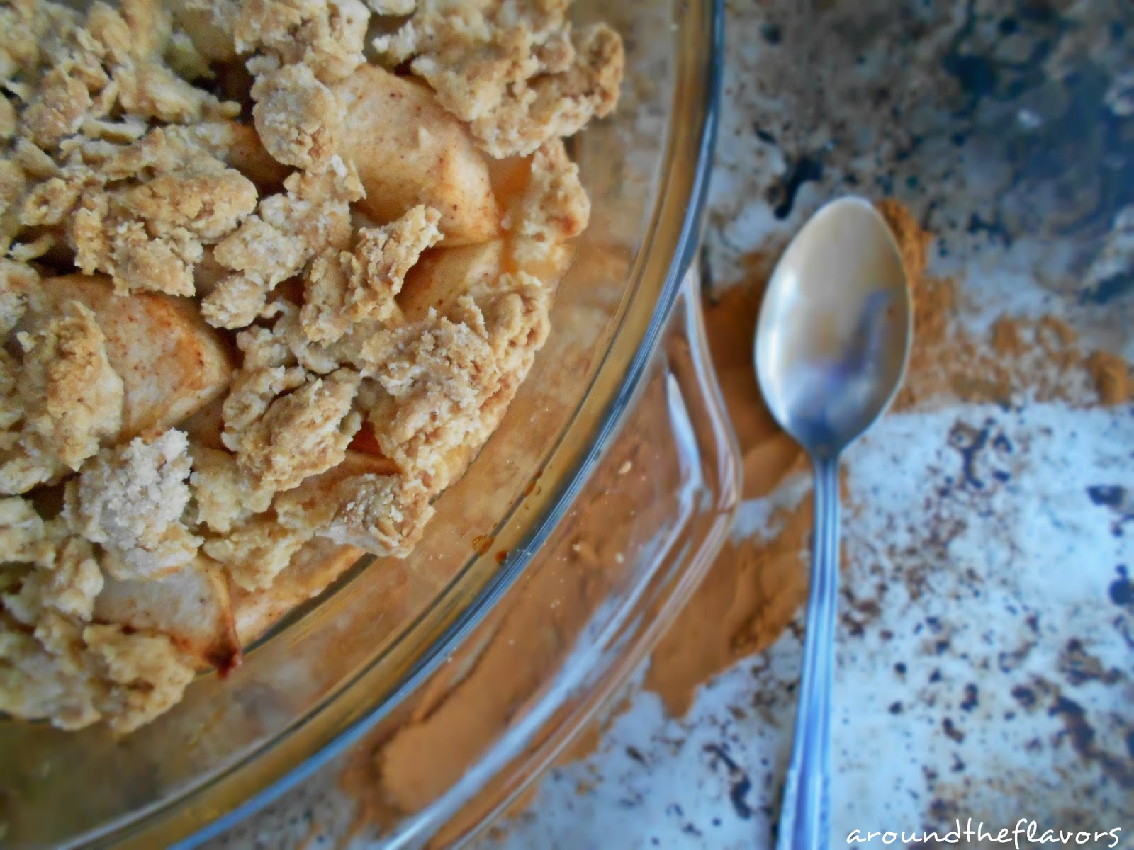Jabłka obierz i pokrój na ósemki. Posyp cynamonem,kolendrą ,cukrem i przełóż do naczynia żaroodpornego.Mąkę,proszek do pieczenia przesiej. Do mąki dodaj sól,jajko i masło. Wyrób kruszonkę i posyp nią jabłka.Jabłka piecz w 190 C przez ok 30-40 minut