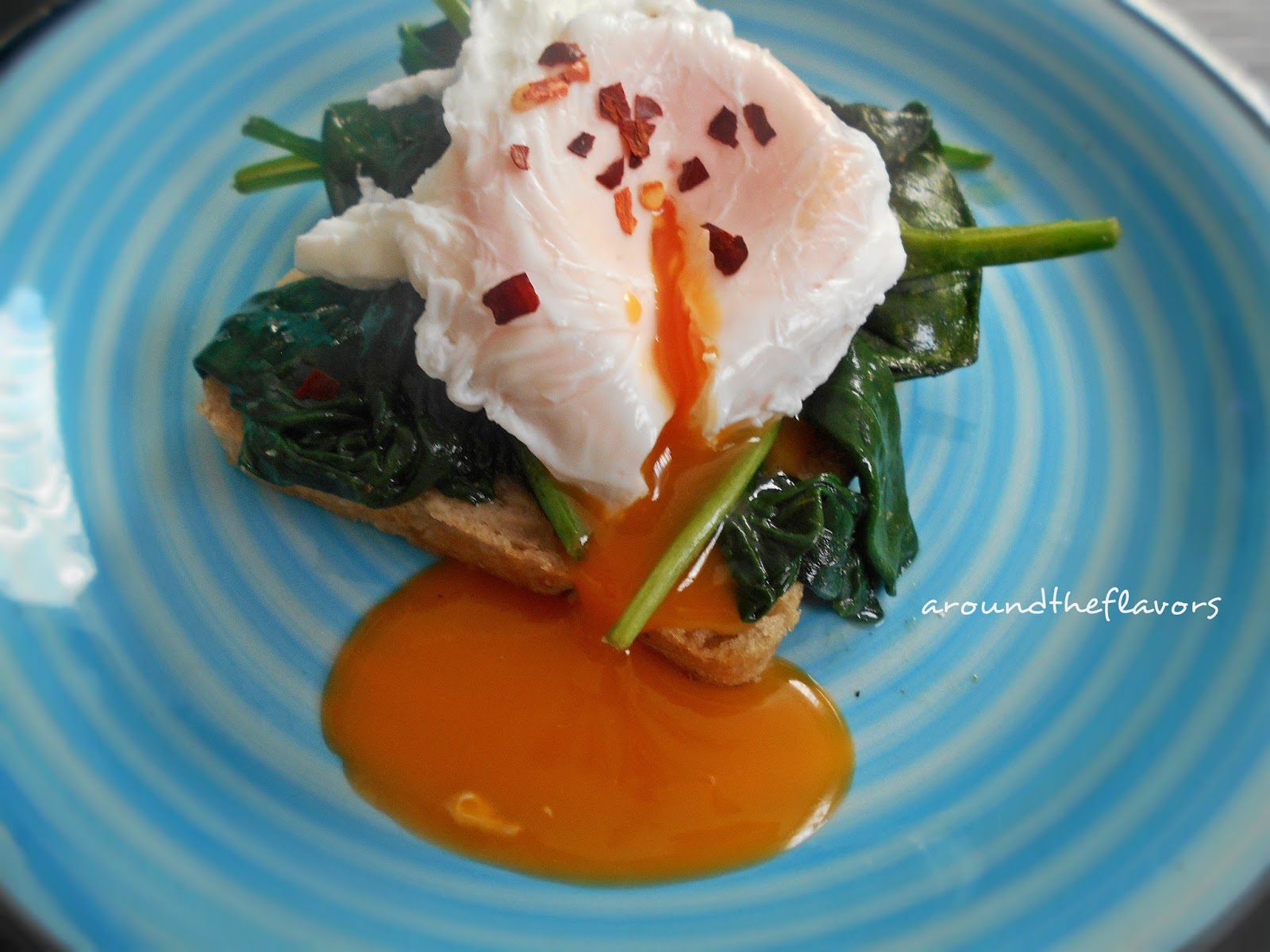 Ta chleb wyłóż szpinak,na szpinak jajka. Posyp płatkami chili. Smacznego !