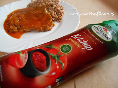 Wodę,ketchup,ocet,musztardę oraz przyprawy wymieszaj w miseczce. Dodaj do karkówki. Wymieszaj.
