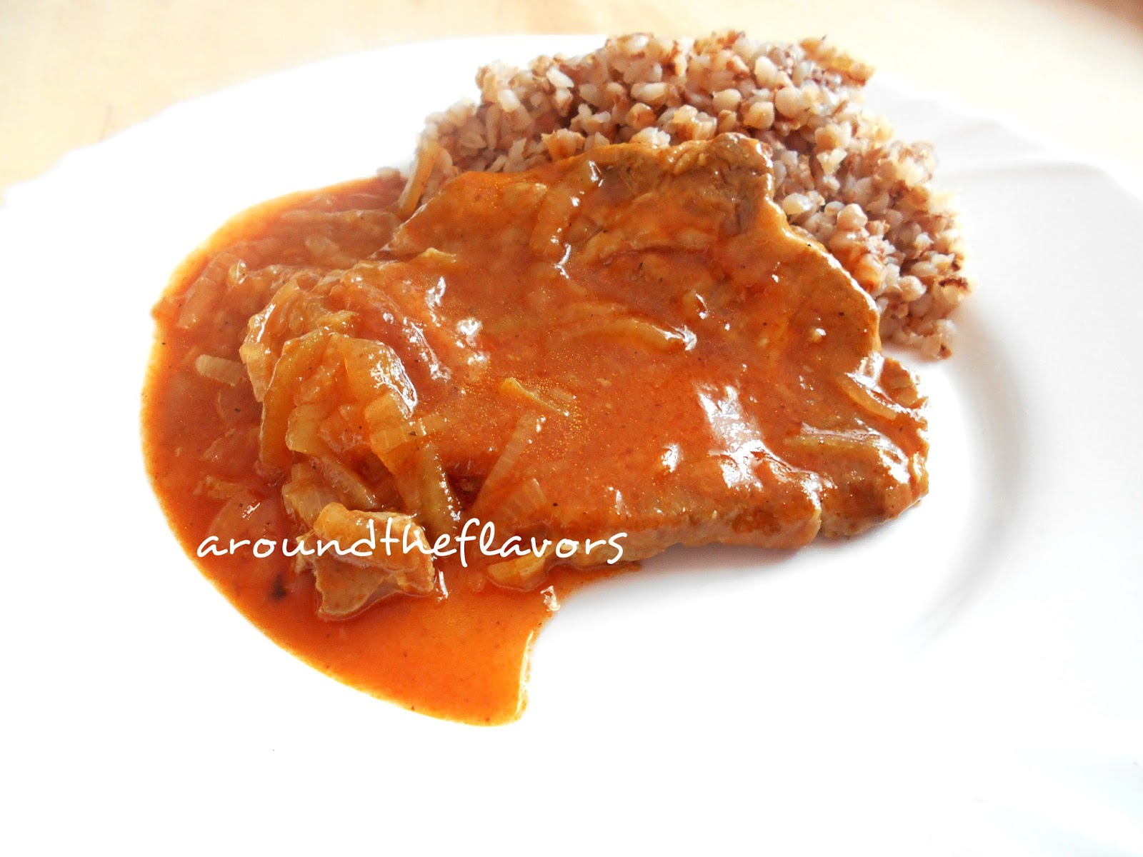 Następnie karkówkę usmaż z obu stron. Dodaj cebulę pokrojoną w plastry.