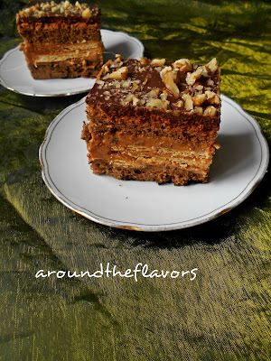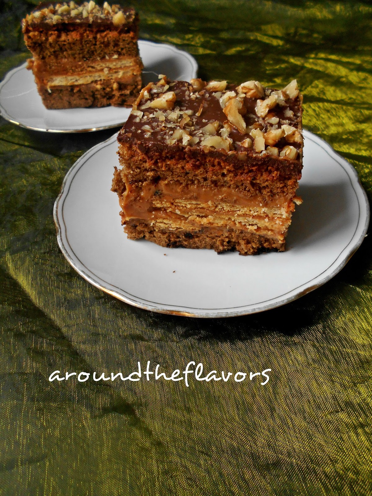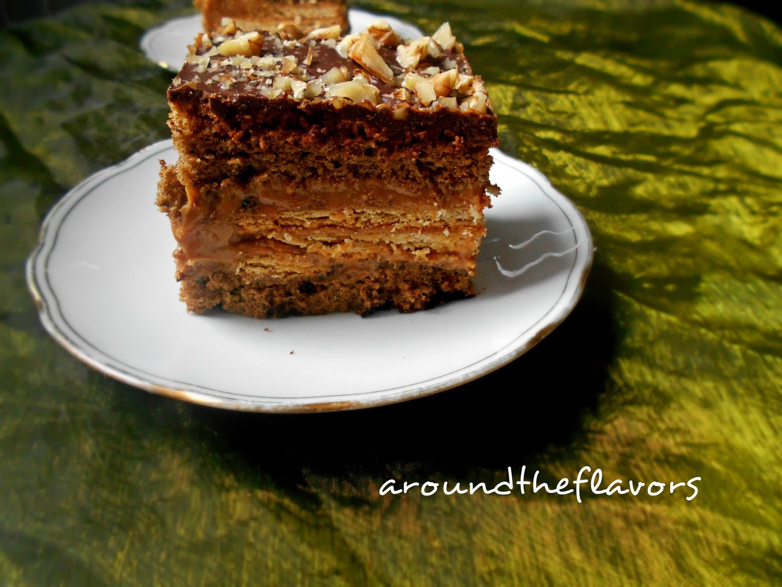 Ostudzone ciasto przekrój na pół. Na spód ciasta wyłóż kajmak,na to krakersy,kajmak,krakersy i jeszcze raz kajmak a na masę wyłóż wierzch ciasta.