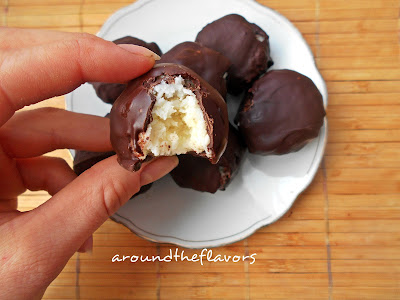 Czekoladę rozpuść w kąpieli wodnej. Kulki kokosowe wyjmij z lodówki i obtocz w czekoladzie.