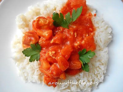 Po tym czasie mięso osącz z marynaty (nie wyrzucaj marynaty) i oprósz mąką,wymieszaj. Kurczaka smaż na oleju sezamowym przez kilka minut. Następnie dodaj przecier pomidorowy,ok. 1/2 szklanki zalewy z ananasa i pozostałą marynatę. Duś pod przykryciem przez ok. 5 minut.