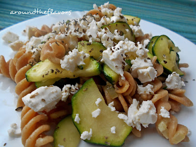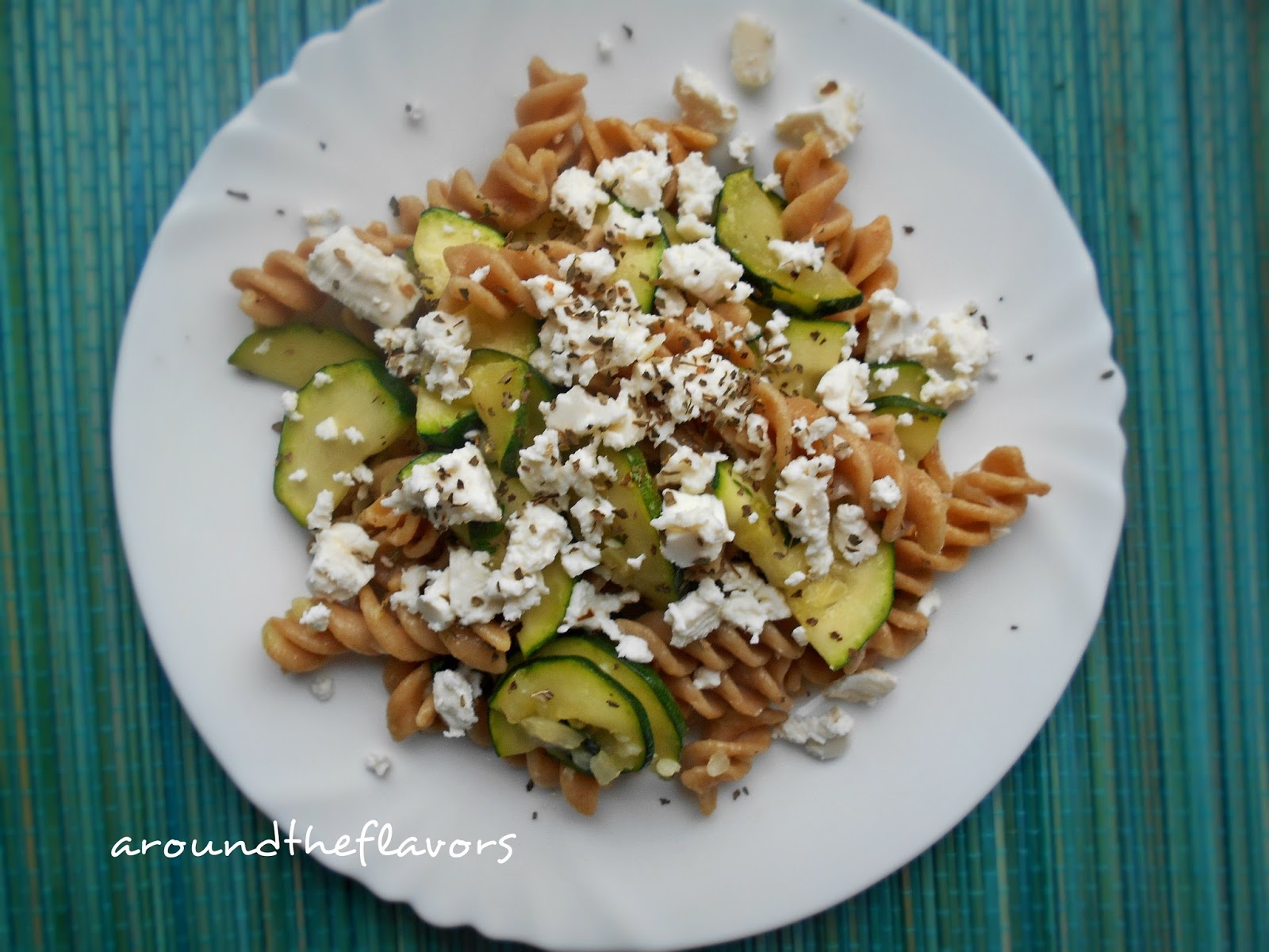 Do cukinii dodaj makaron i wymieszaj. Makaron przełóż na talerze,posyp pokruszonym serem i bazylią.