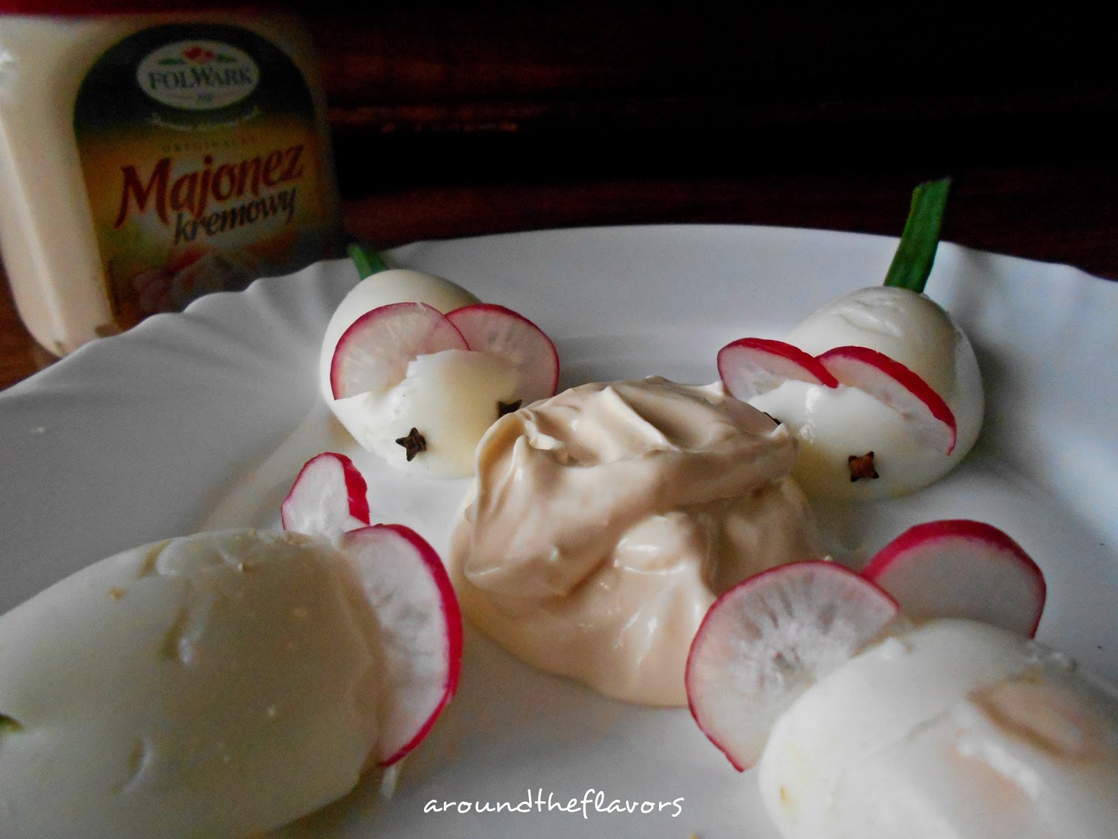 Rzodkiewkę pokrój w półplasterki. Włóż do przygotowanych nacięć. Z drugiej strony jajek delikatnie umieść szczypiorek. Z goździków czy np kaparów zrób oczy. Na środek talerzy wyłóż