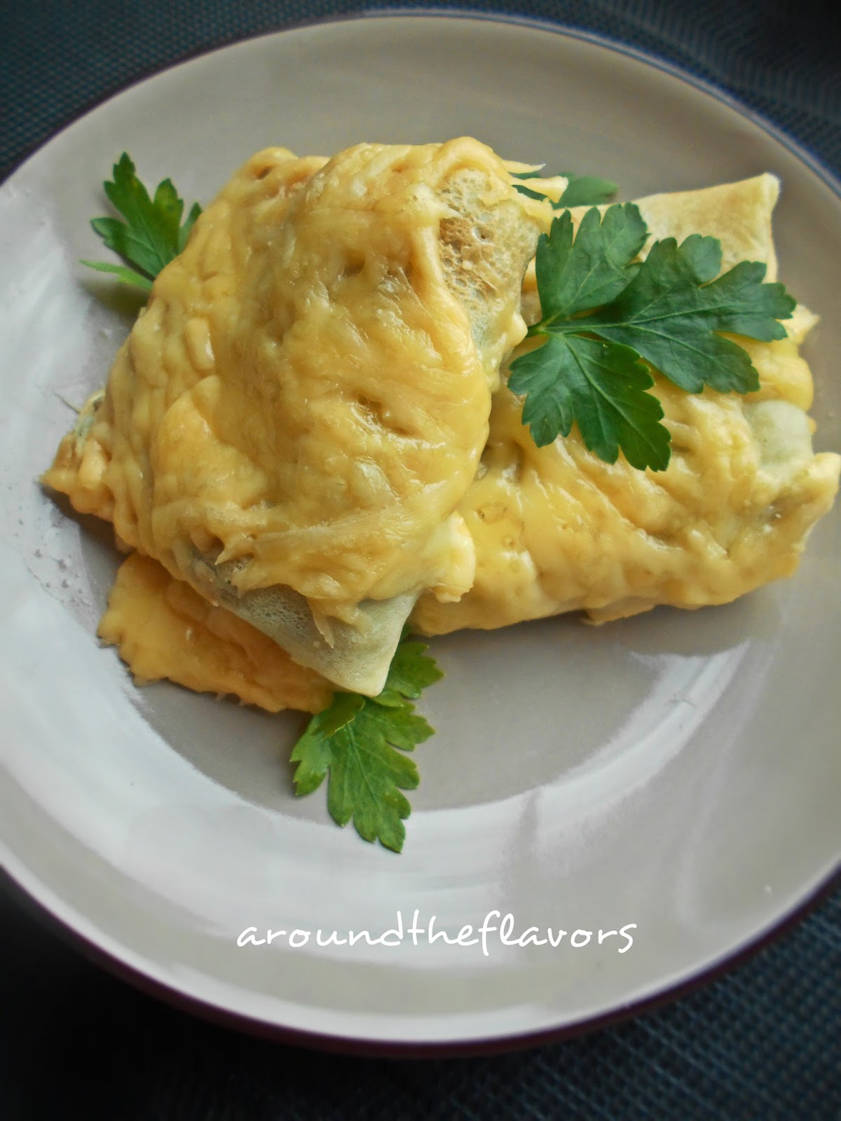 Na wcześniej przygotowane naleśniki układaj farsz i zwiń. Naleśniki wyłóż do naczynia żaroodpornego i posyp serem startym na tarce o grubych oczkach.