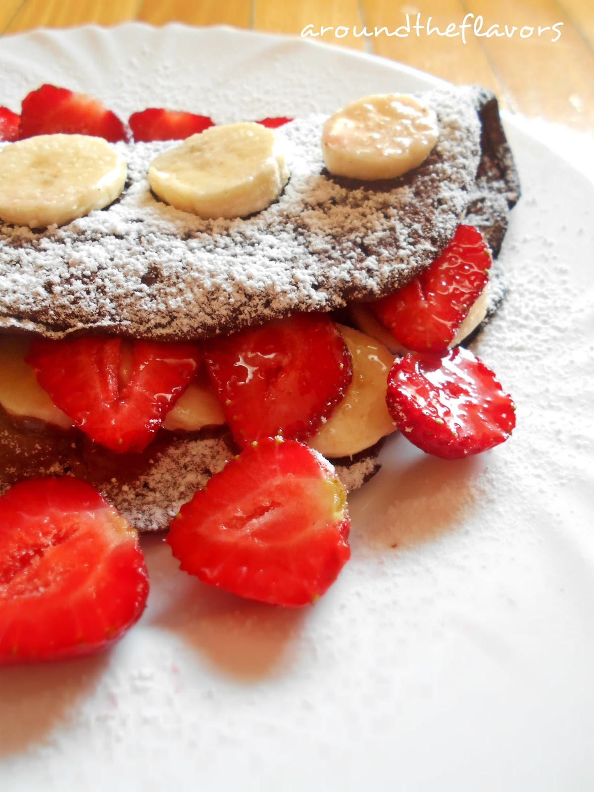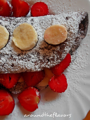 Gotowy omlet posmaruj jogurtem,złóż na pół i posyp cukrem pudrem. Podawaj z pokrojonymi owocami.