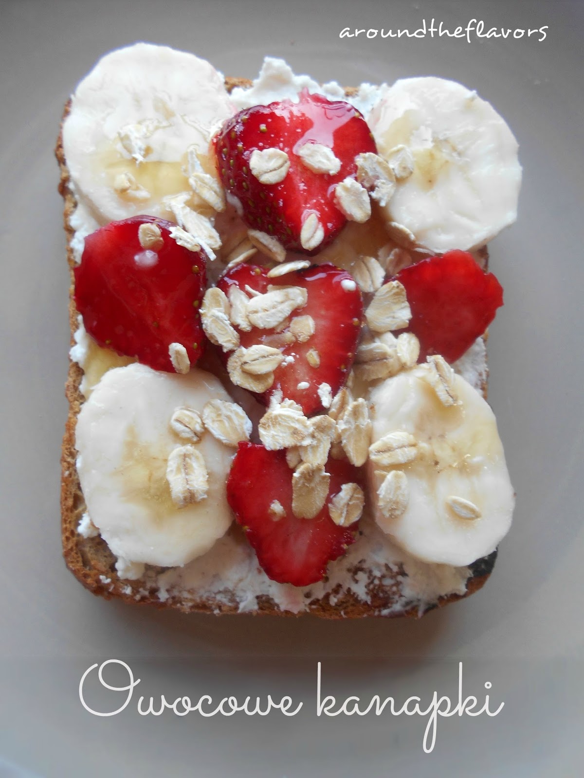 Gotową bułkę posmaruj twarożkiem,ułóż owoce,polej miodem i posyp płatkami owsianymi.