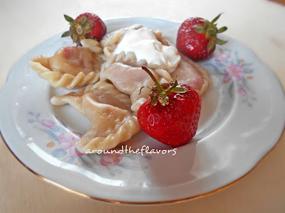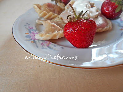 Z mąki ,soli, oleju i wody zagnieć ciasto. Przykryj czystą ściereczką i odstaw na ok. 20 minut. Po tym czasie ciasto rozwałkuj i wytnij kółka. Na każdym kawałku ciasta wyłóż po jednej truskawce (jeśli truskawki są duże trzeba je przekroić na mniejsze kawałki) posyp cukrem ok. 1/2 łyżeczki i sklej pierogi.
