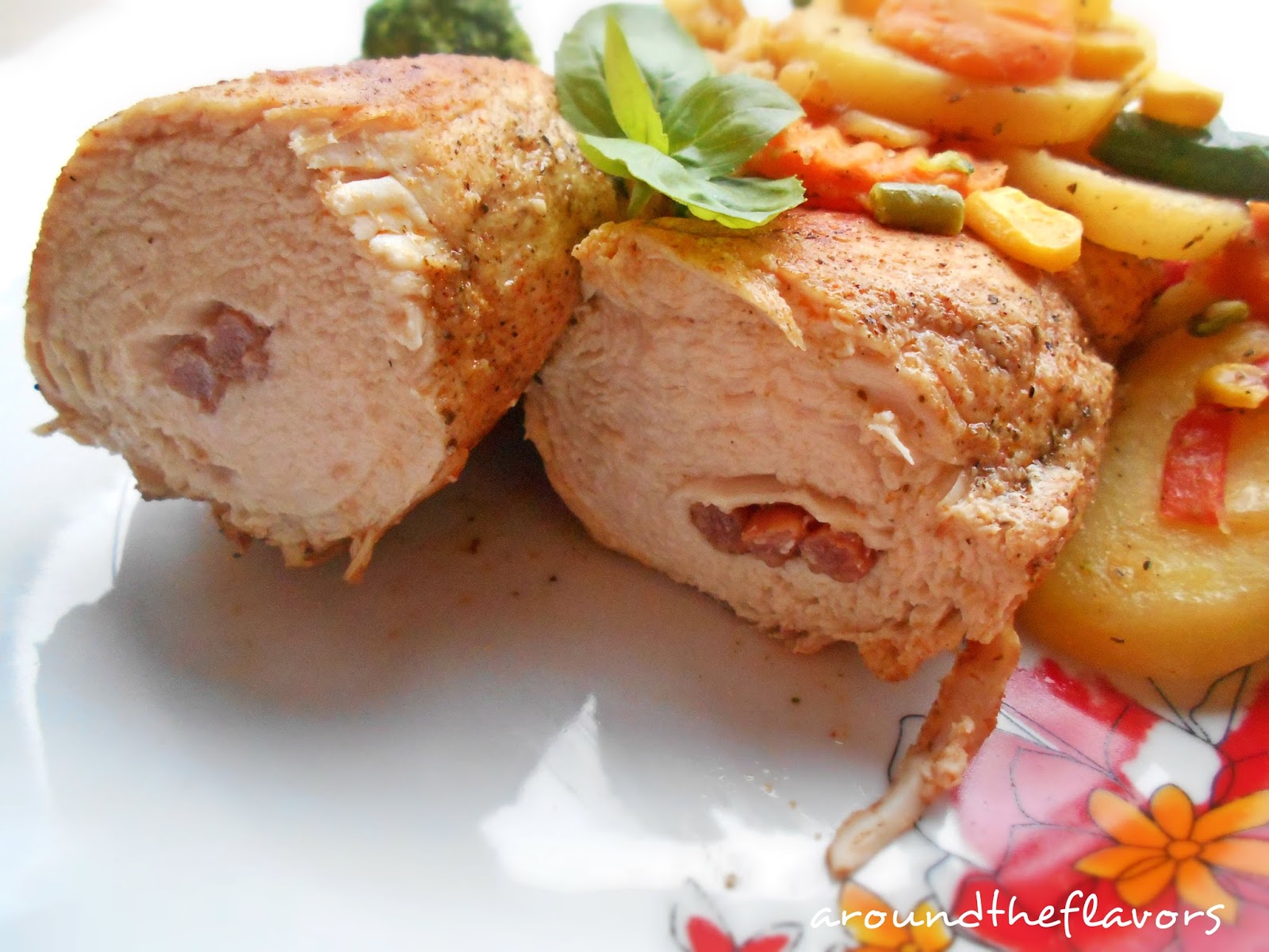 W każdym filecie z kurczaka zrób nacięcie,tak aby powstał otwór. W każdym otworze umieść kabanosy.