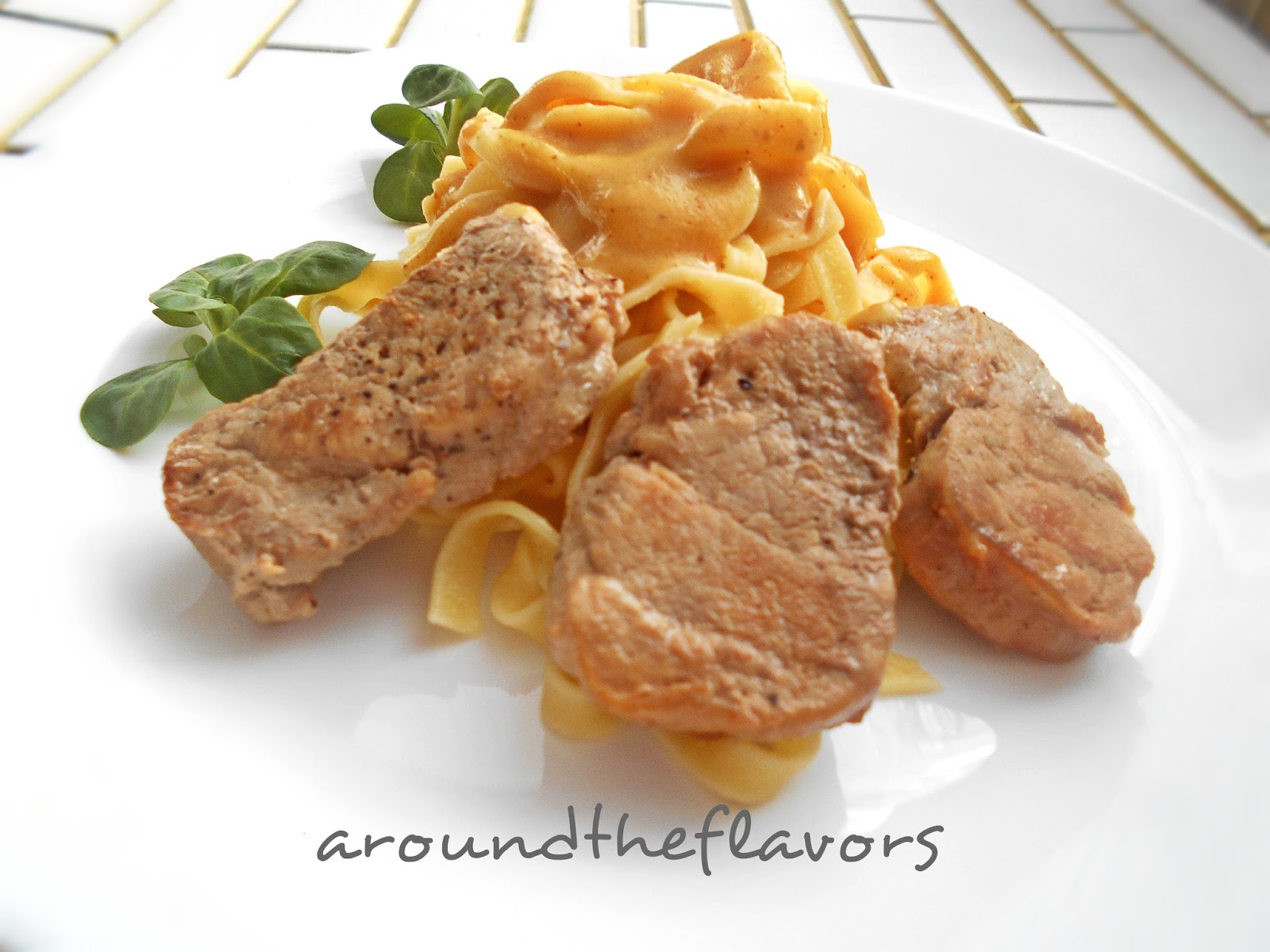 Makaron wymieszaj z sosem i podawaj z polędwiczkami.