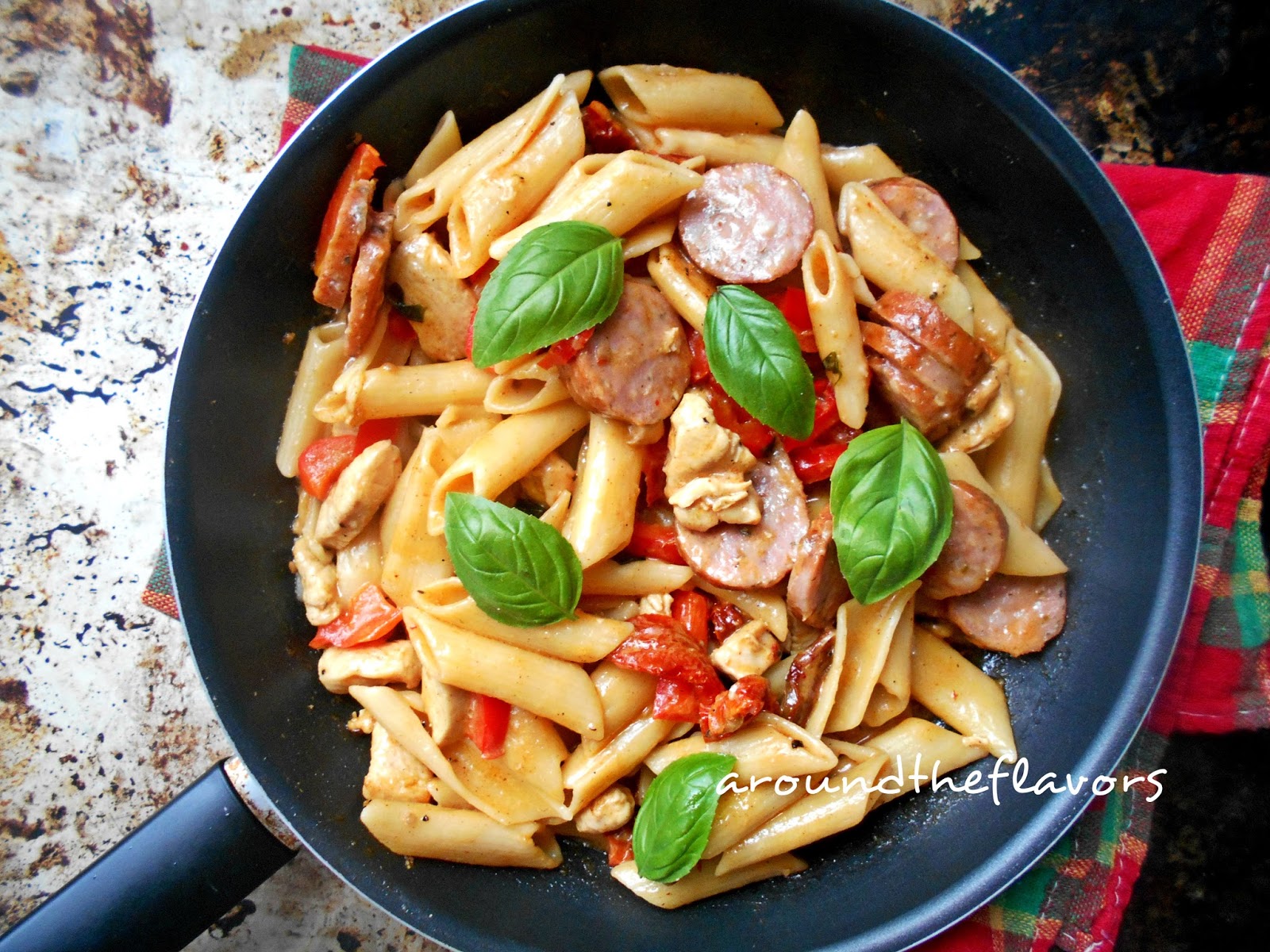 Do zawartości patelni dodaj pokrojoną kiełbasę oraz makaron i wymieszaj.