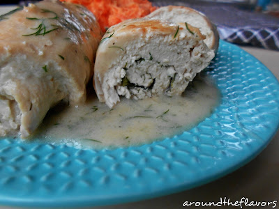 Mięso natrzyj solą,czosnkiem i połową koperku. Z mięsa uformuj roladki i zepnij wykałaczką.