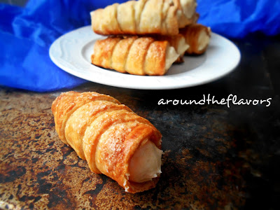 Paski owijaj wkoło rurek i układaj na blaszce wyłożonej papierem do pieczenia. Posmaruj rozkłóconym jajkiem i posyp cukrem.