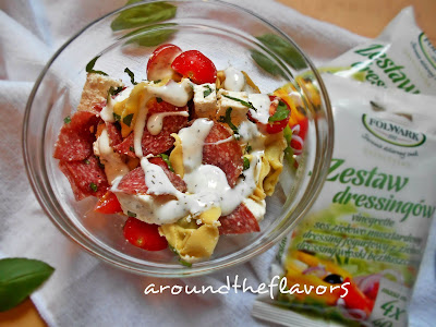 Sałatka na wypasie, dlaczego? Jest w niech chyba wszystko. Tortellini, ser,salami,pomidorki ...Całość polana pysznym