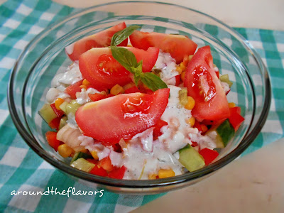Paprykę,cebulę i ogórki pokrój w kostkę,przełóż do miski i dodaj kukurydzę.Wymieszaj.