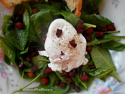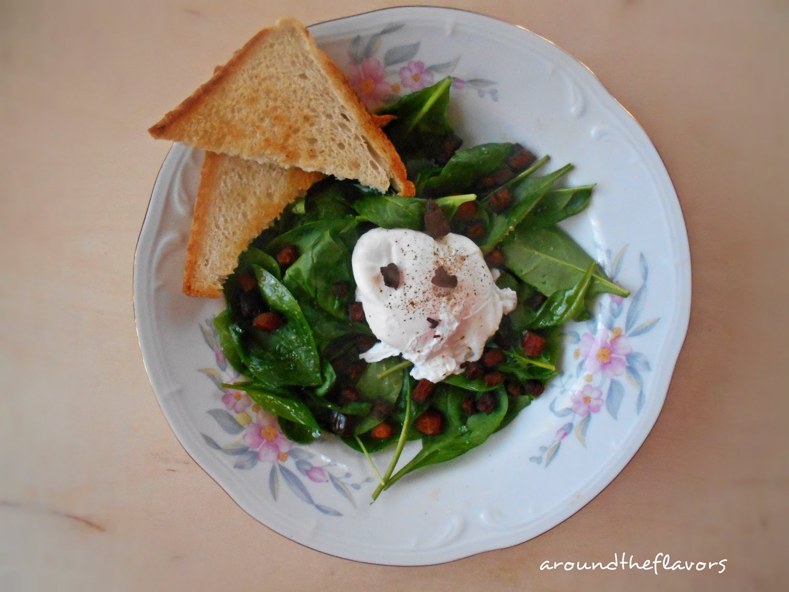 Szpinak przełóż na talerze ,dodaj oliwę z oliwek,ocet winny,cukier i wymieszaj. Na szpinak wyłóż jajka i boczek. Dopraw solą i pieprzem.