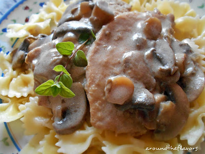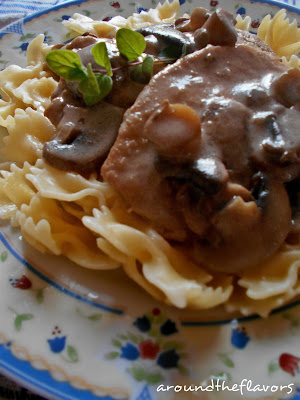 Na tym samym oleju podsmaż cebulę z pieczarkami. Do pieczarek przełóż kotlety,zalej wodą i duś przez ok. 40 minut.