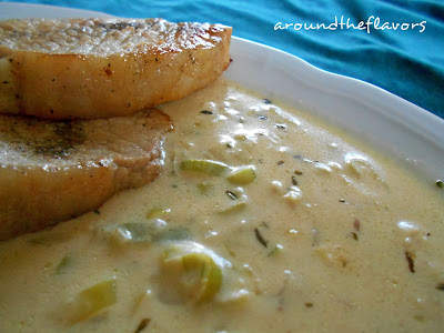Pora pokrój i podsmaż na maśle wraz z przeciśniętym przez praskę czosnkiem. Zmniejsz ogień i dodaj bulion warzywny. Mieszając gotuj jeszcze przez chwilę.