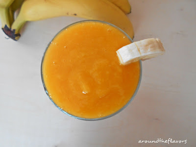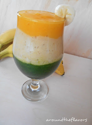 Banana obierz i pokrój, przełóż do miski. Dodaj miód i wodę kokosową,zmiksuj i wyłóż na szpinak.
