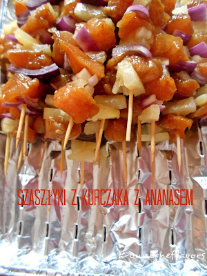 Ananasa i cebulę pokrój.Na patyczki nakładaj kawałki mięsa,cebulę i ananasa.