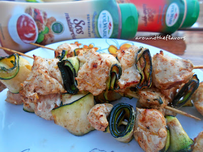 Na wykałaczki nakładaj cukinię zawiniętą w roladki i kurczaka. Piecz na grillu. Podawaj z sosami.