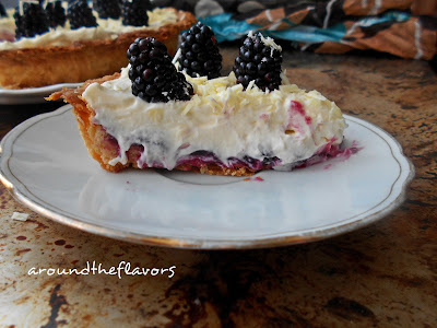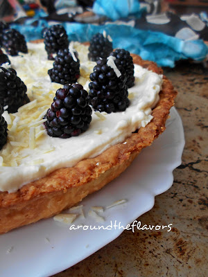 Na ostudzone ciasto wyłóż dżem,a na dżem masę. Na wierzch wyłóż jeżyny. Całość posyp startą,białą czekoladą. Tartę wstaw do lodówki na ok. 2 godziny.