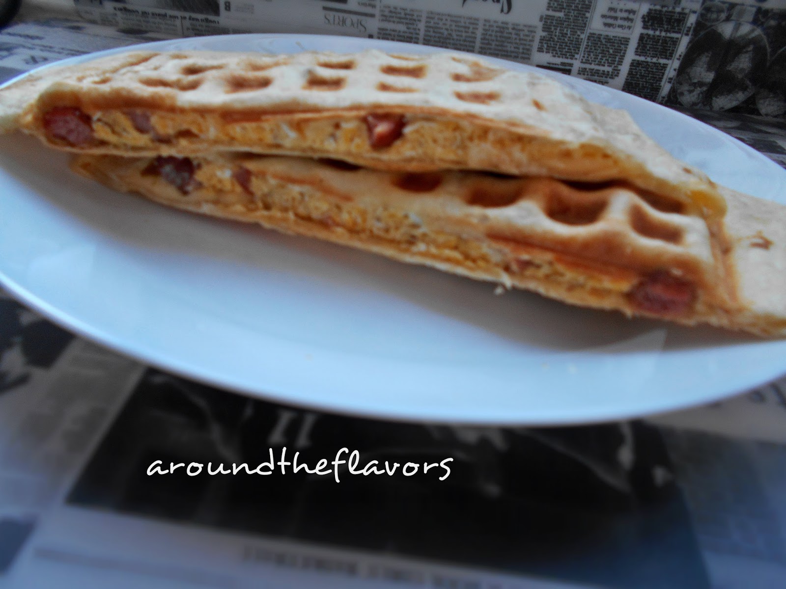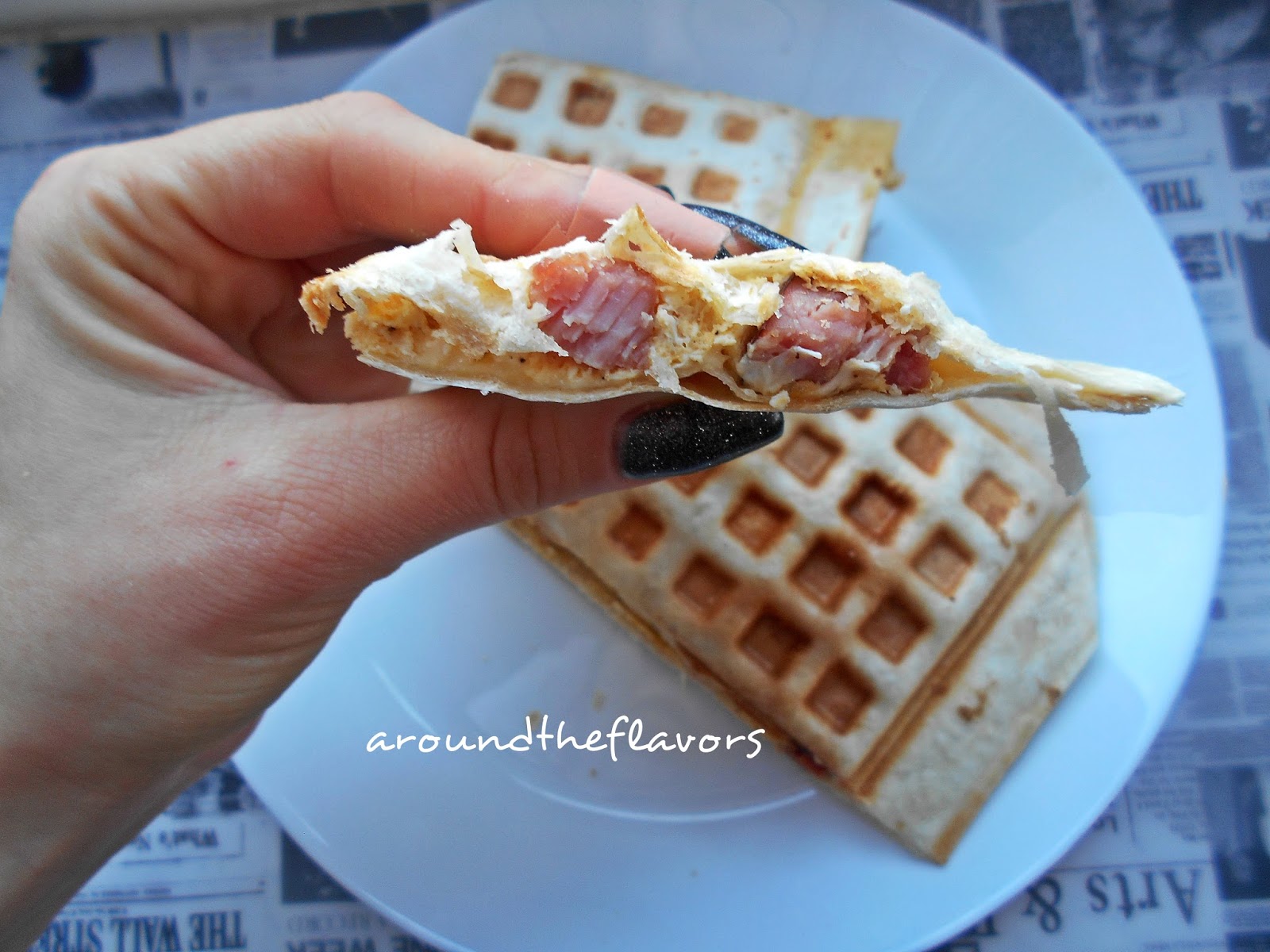 Gofrownicę nagrzej i posmaruj olejem. Włóż wcześniej przygotowaną tortillę i piecz ok. 8 minut. Smacznego !