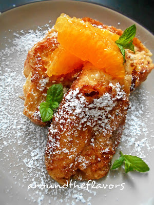 Tosty wyłóż na talerze. Podawaj z filetami z pomarańczy oraz oprósz cukrem pudrem.