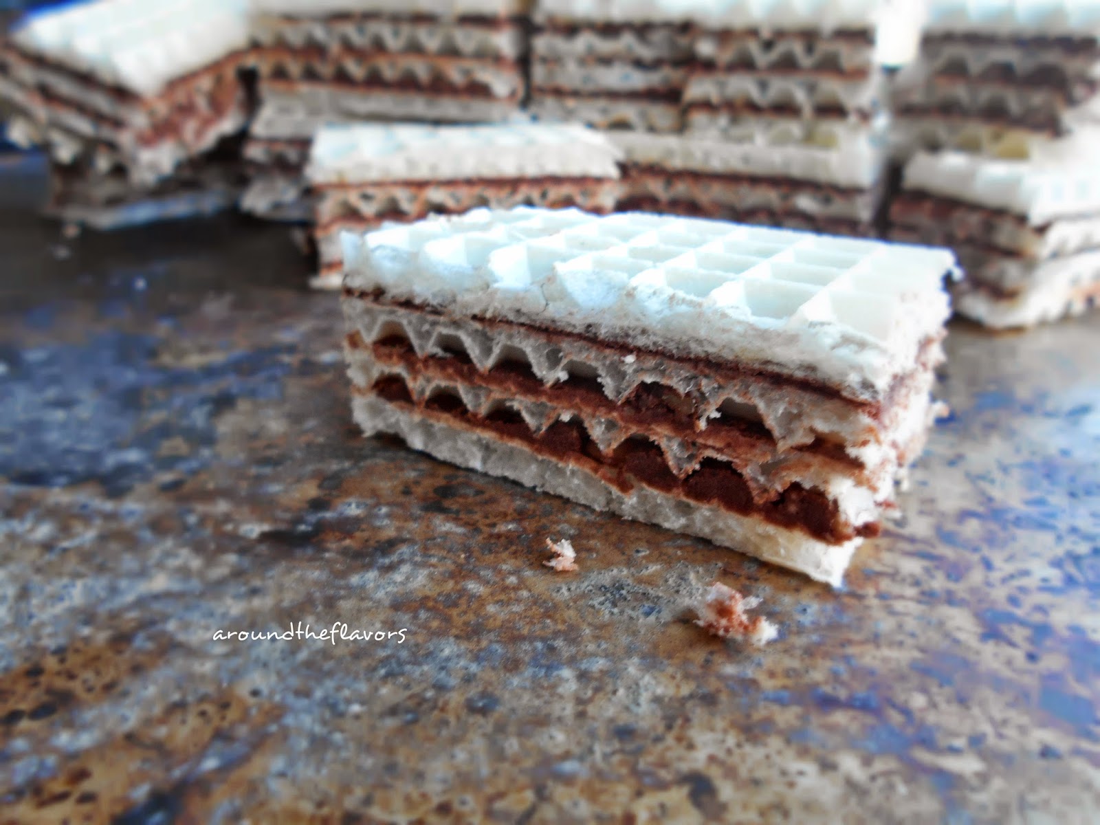 Wafle przełóż masą. Na koniec wafle przyciśnij np deseczką,i garnkiem z wodą. Odstaw na całą noc.