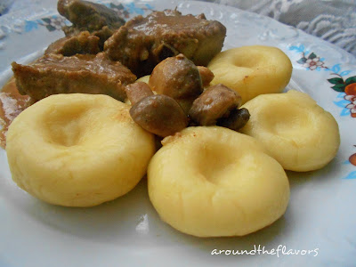 Dodaj mąkę ziemniaczaną, jajko i szczyptę soli. Wyrób ciasto. Uformuj spłaszczone kulki z dziurką w środku. Kluski gotuj w wrzącej ,osolonej wodzie przez ok. 4 minuty od momentu wypłynięcia na wierzch.