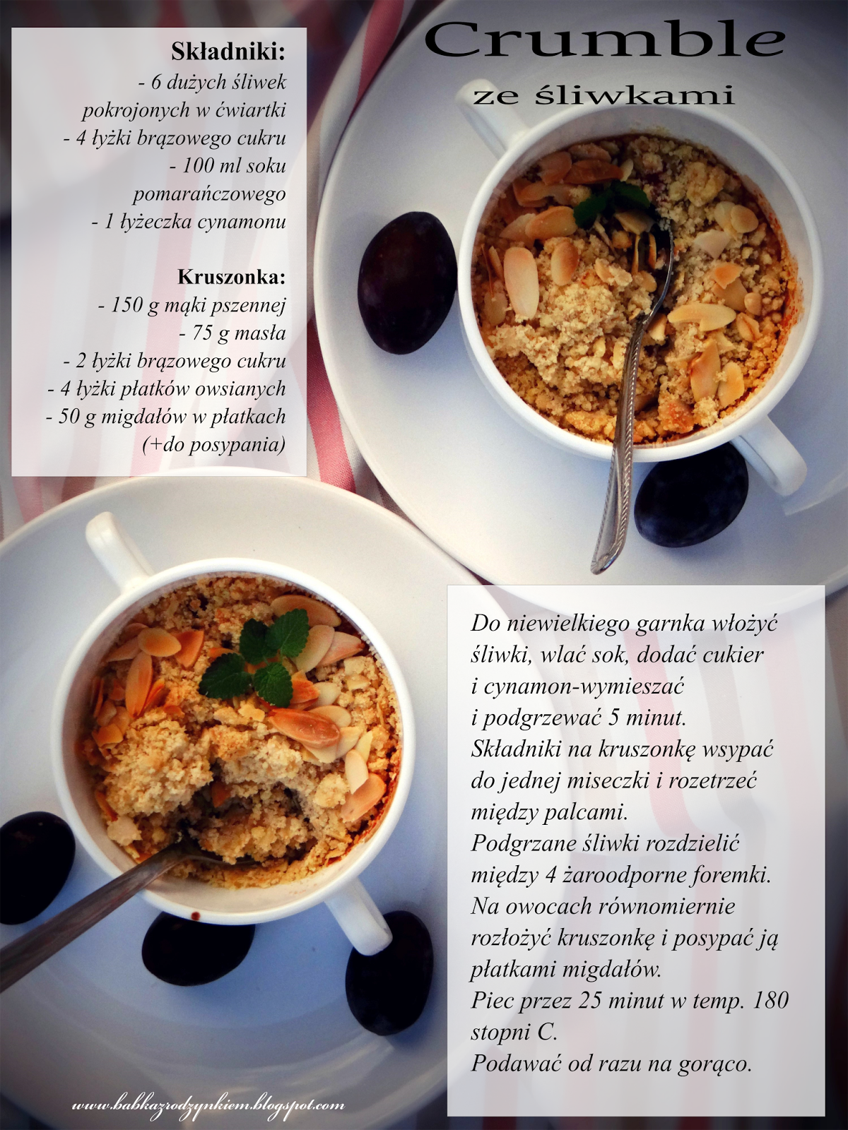 Składniki:(na 4 porcje)- 6 dużych śliwek pokrojonych w ćwiartki