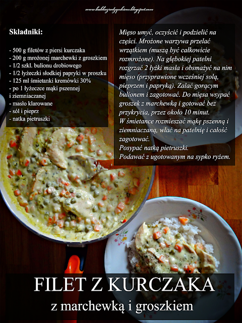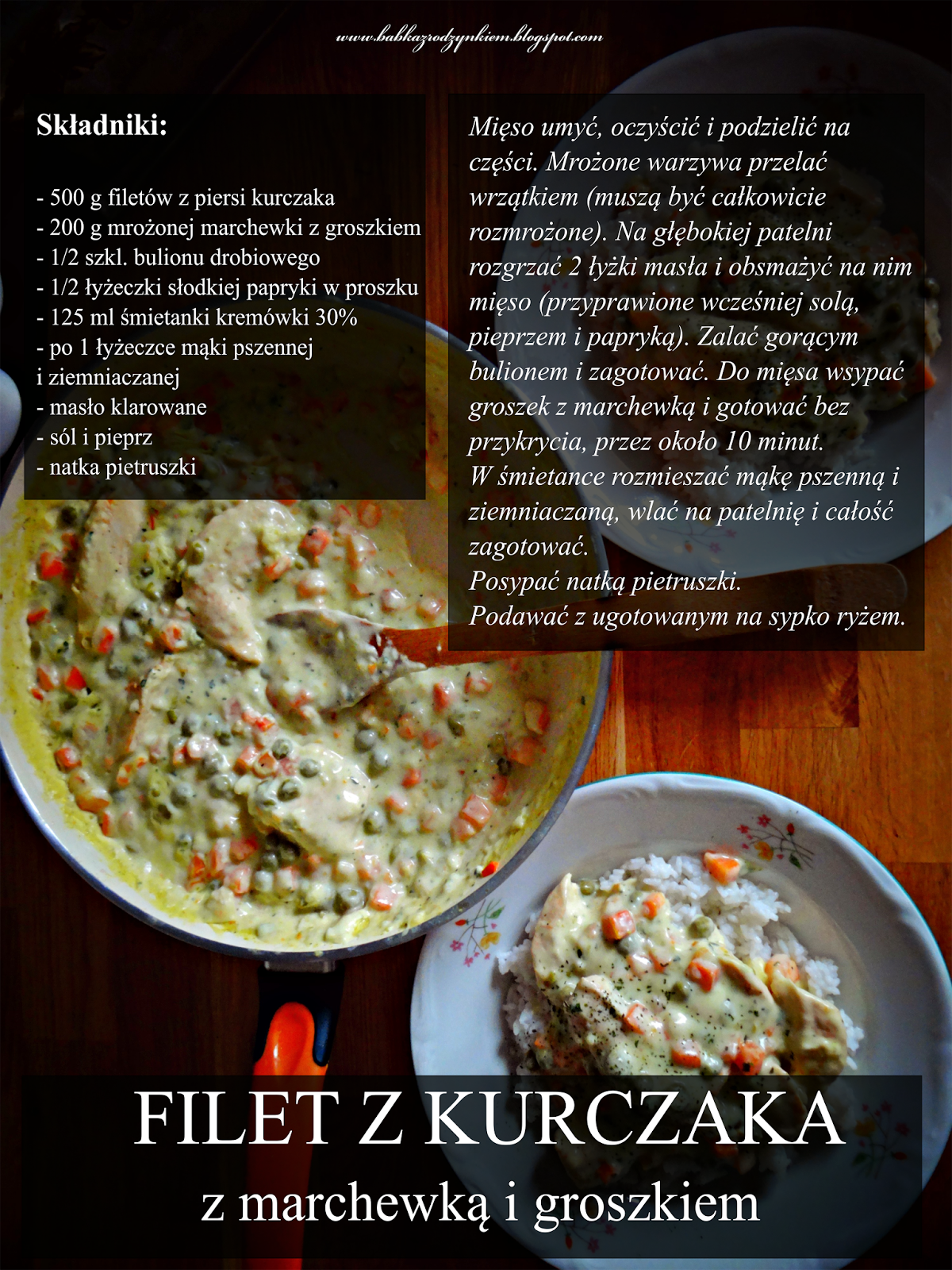 Delikatna pierś z kurczaka w kremowym sosie z dodatkiem marchewki i groszku... Podana z ugotowanym na sypko ryżem, to jedno z moich ulubionych dań obiadowych, które w smaku przypomina klasyczną potrawkę z kurczaka którą uwielbiam...:-)