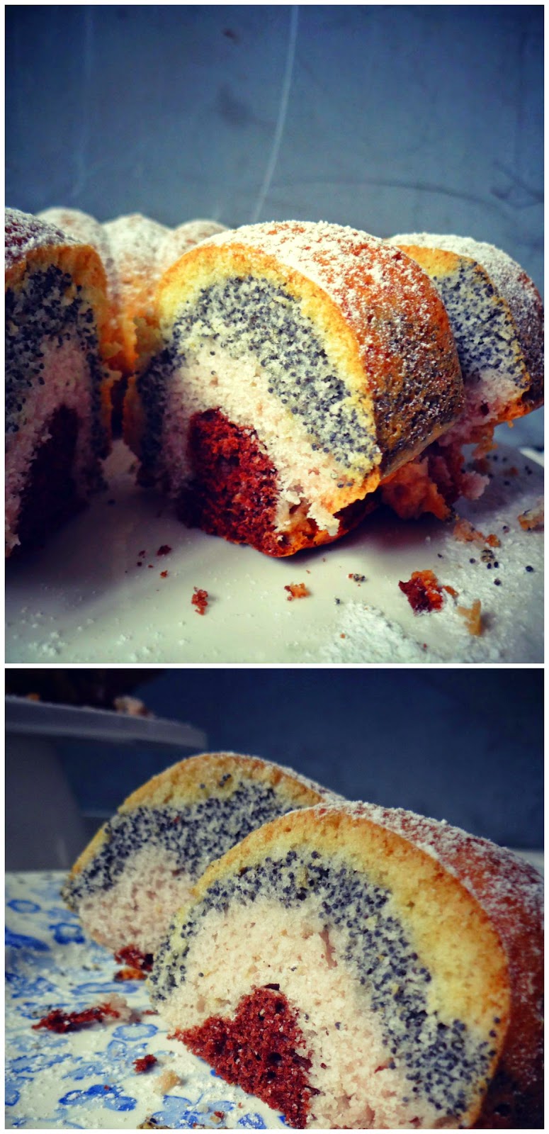 Ciasto podzielić na cztery części. Do jednej dodać łyżkę mąki, do drugiej kakao, do trzeciej mak a do czwartej kisiel.