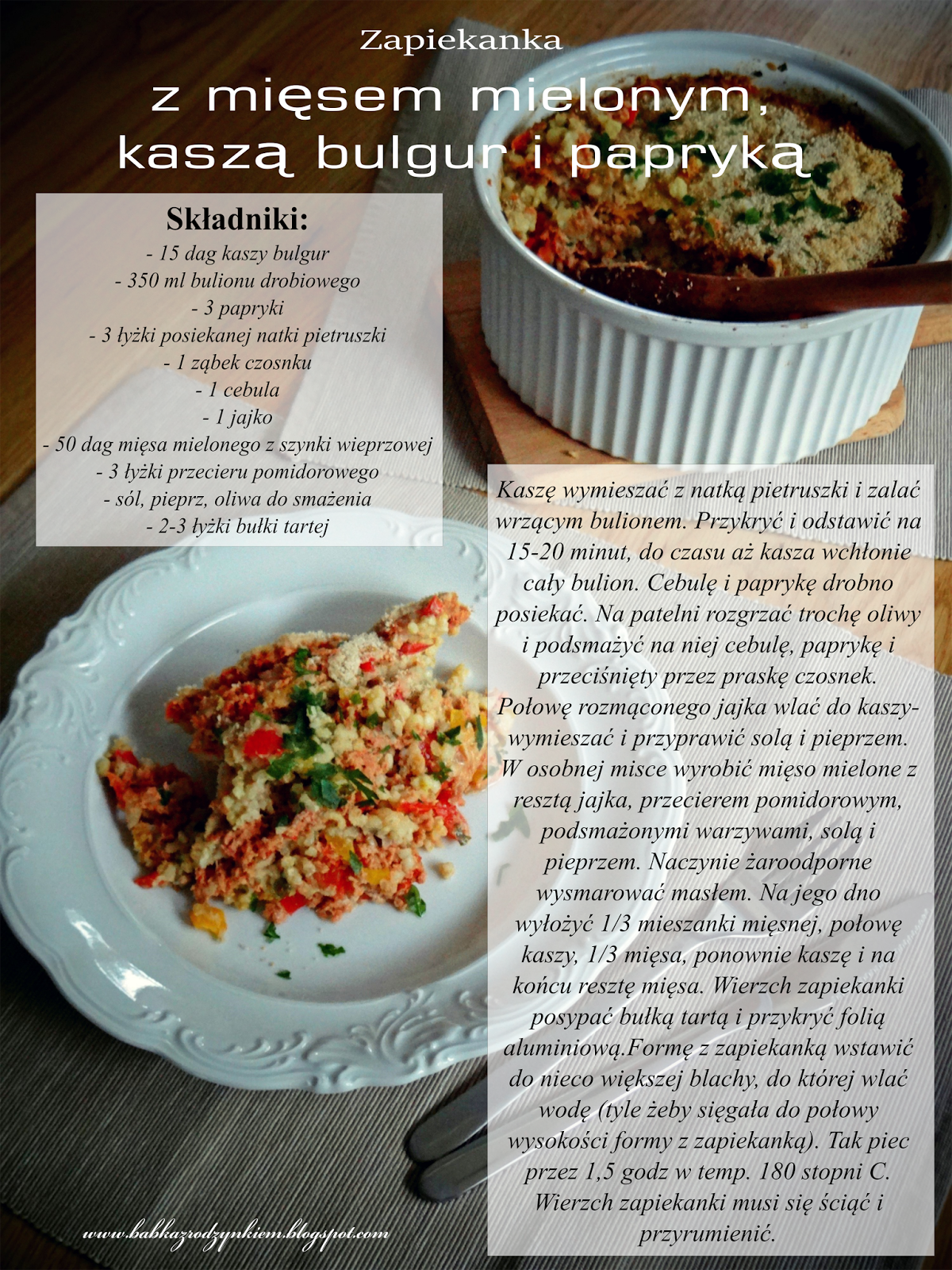Naczynie żaroodporne wysmarować masłem. Na jego dno wyłożyć 1/3 mieszanki mięsnej, połowę kaszy, 1/3 mięsa, ponownie kaszę i na końcu resztę mięsa.