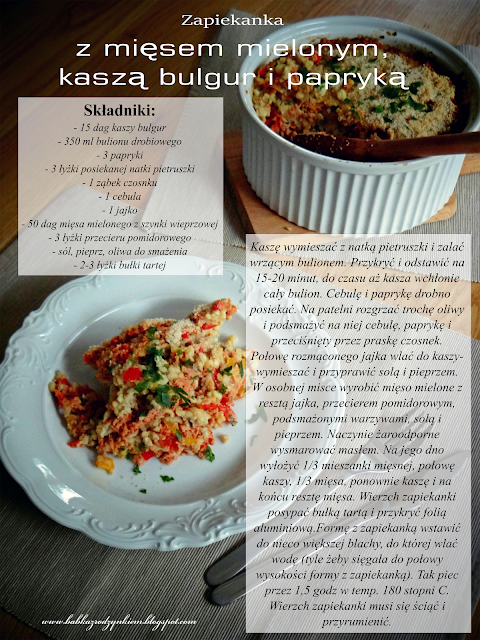 Formę z zapiekanką wstawić do nieco większej blachy, do której wlać wodę (tyle żeby sięgała do połowy wysokości formy z zapiekanką). Tak piec przez 1,5 godz w temp. 180 stopni C.