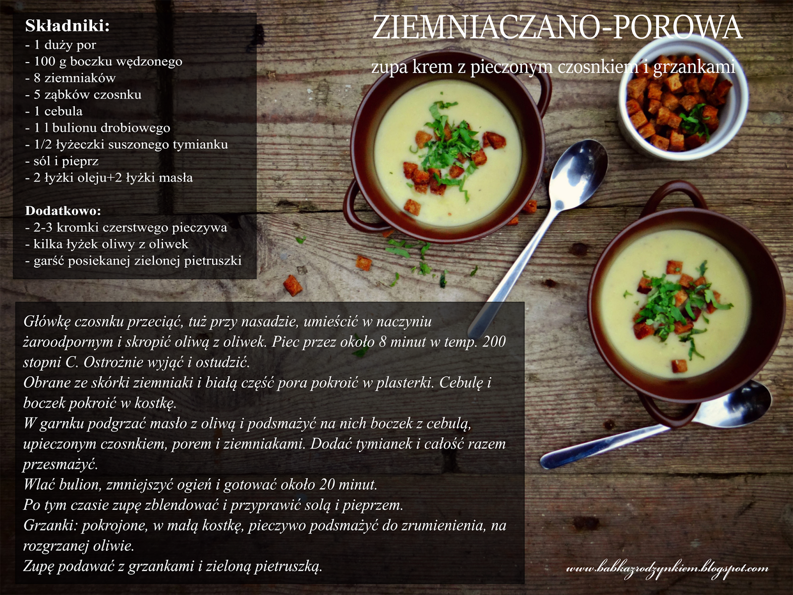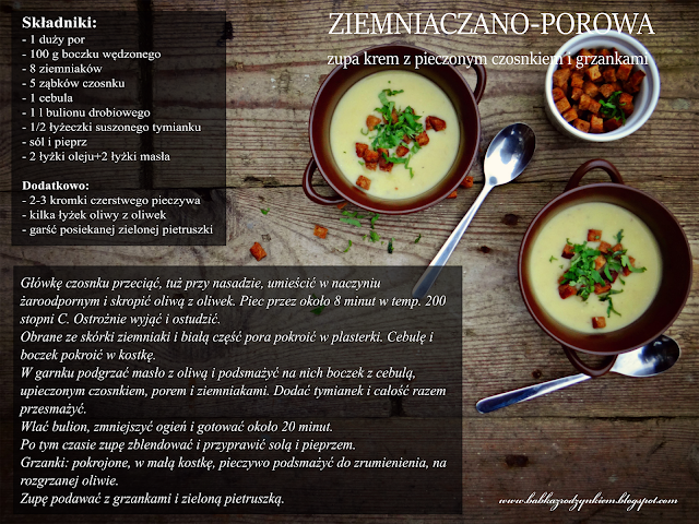 Gęsta, kremowa i sycąca zupa ziemniaczano-porowa z wyraźnym czosnkowym akcentem i chrupiącymi grzankami, doskonale rozgrzeje i zaspokoi głód po powrocie z pracy lub długiego zimowego spaceru...