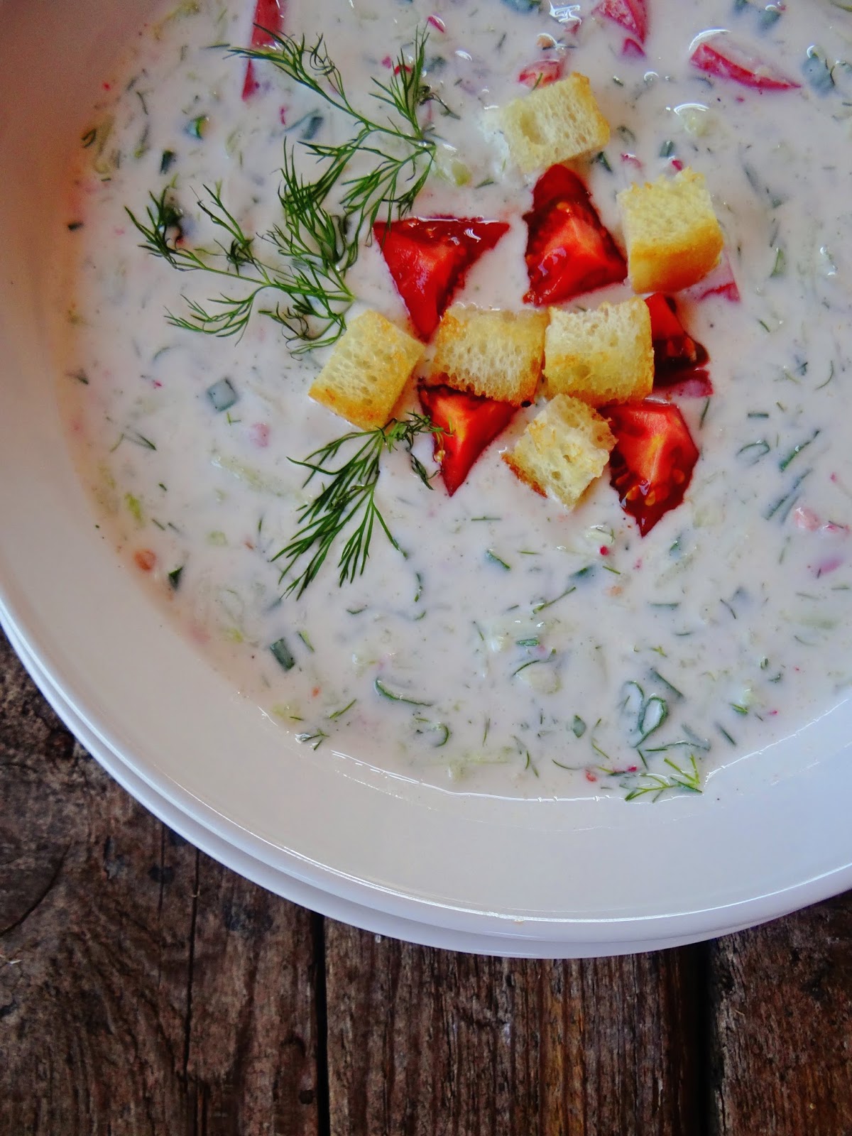 Do miski, na tarce o dużych oczkach, zetrzeć: ogórka i rzodkiewki, pomidora pokroić w niewielką kostkę. Umyty szczypiorek i koperek drobno posiekać-wrzucić do warzyw. Dodać przeciśnięty przez praskę czosnek. Całość zalać kefirem i jogurtem naturalnym, wlać oliwę, przyprawić do smaku solą i pieprzem-dokładnie wymieszać. Chłodnik wstawić na 1 godzinę do lodówki.