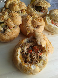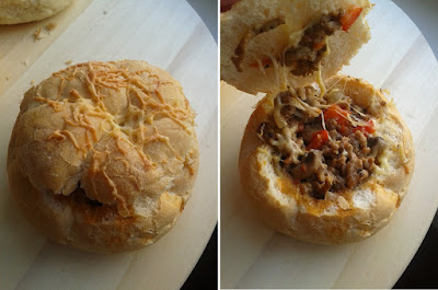 Teraz czas na bułki. Odkrój im "kapelutki". Wyciągnij "miąż" i niewielką jego ilość wrzuć na patelnię (resztę zjedz, podziel się z ptaszkami lub zostaw do zagęszczania innych sosów). Bułeczki posmaruj od środka odrobiną masła. Nagrzej piekarnik do 200 st. C. Wstaw na chwilę bułeczki aż masło się rozpuści, a bułeczki staną się lekko chrupiące. Wyjmij. Do każdej nałóż farsz. Zetrzyj na nie ser żółty. Przykryj "kapelutkiem" i znów zetrzyj starty ser (na małych oczkach- dzięki temu powstanie piękna "pajęczynka"). Wstaw do piekarnika do momentu rozpuszczenia się sera i przyrumienia się bułeczek.