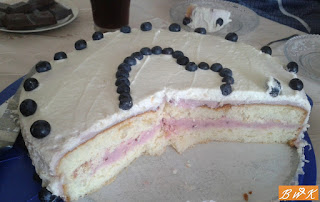 Ubij śmietankę, dodawaj stopniowo cukier puder. Wyłóż na wierzch tortu. Udekoruj borówkami.