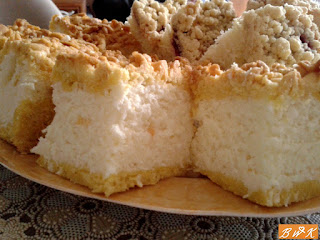 każdy kto widzi to ciasto od razu myśli sernik. Otóż NIE! Nie ma tu grama twarogu. Ciacho nie jest za słodkie i ukrywa jeden z często uwielbianych składników... wiórki kokosowe! :)