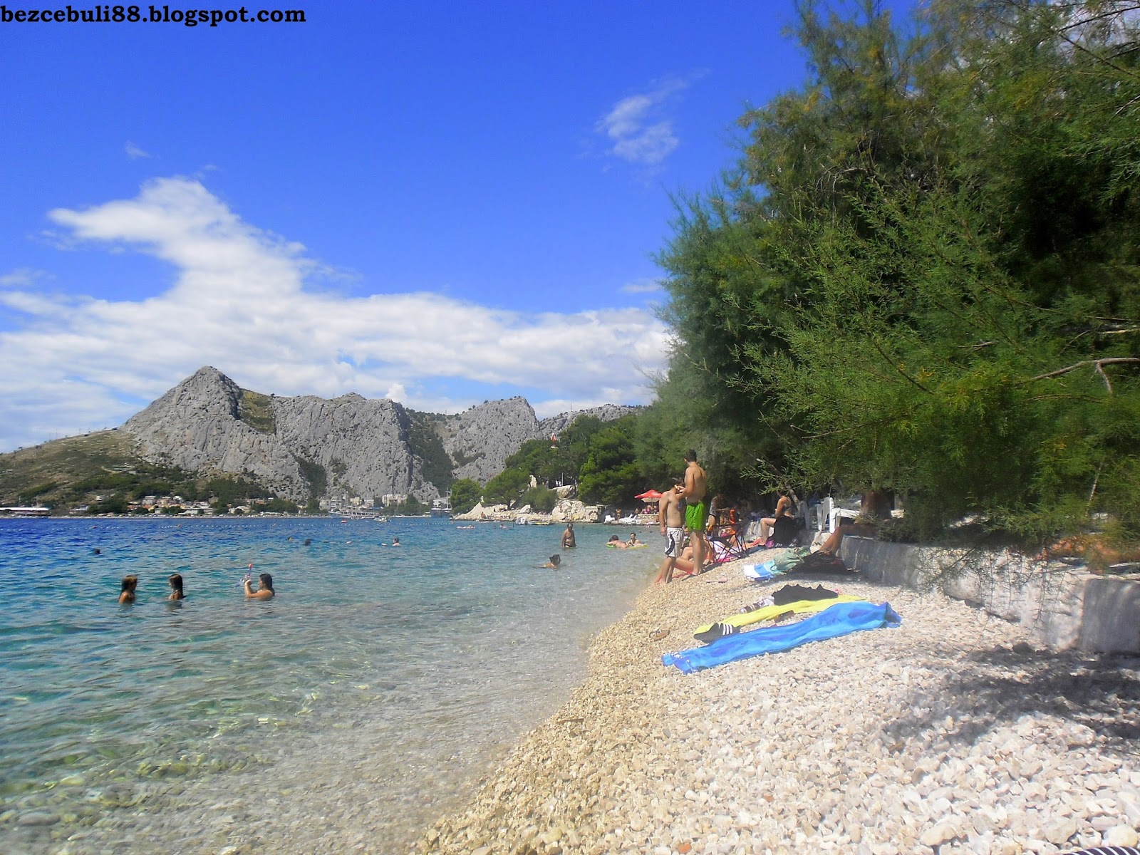 wąska plaża w Omisiu, znajdująca się tuż przy wyjeździe z miasta, w stronę Makarskiej.