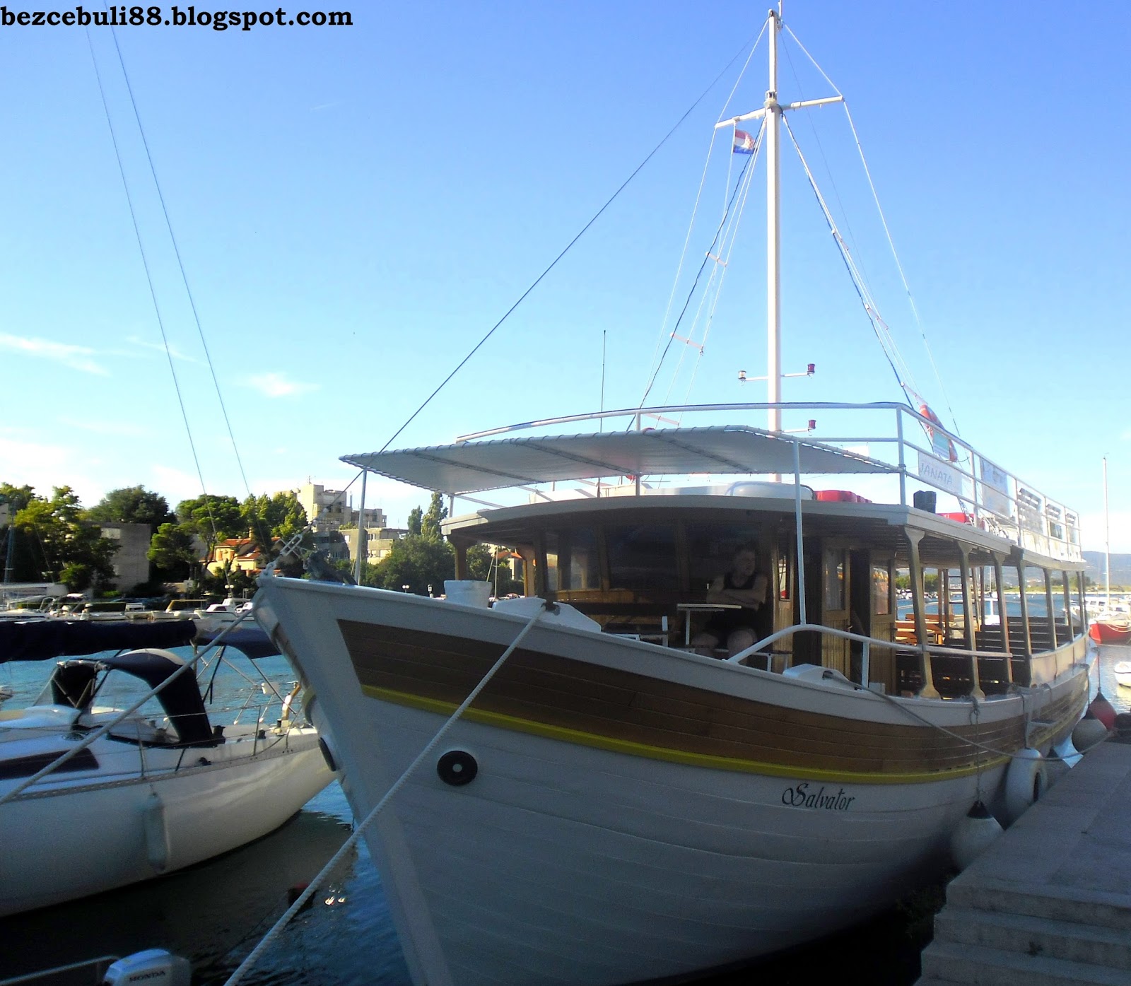 Statek Salvator, 6-cio godzinny rejs do Supetaru + obiad na statku w drodze powrotnej w cenie 90 złotych za osobę. Statek wypływa z rzeki Cetiny i tam też należy szukać stoiska, gdzie można zamówić bilety na rejs.