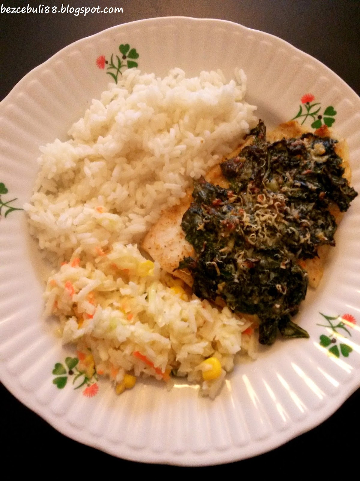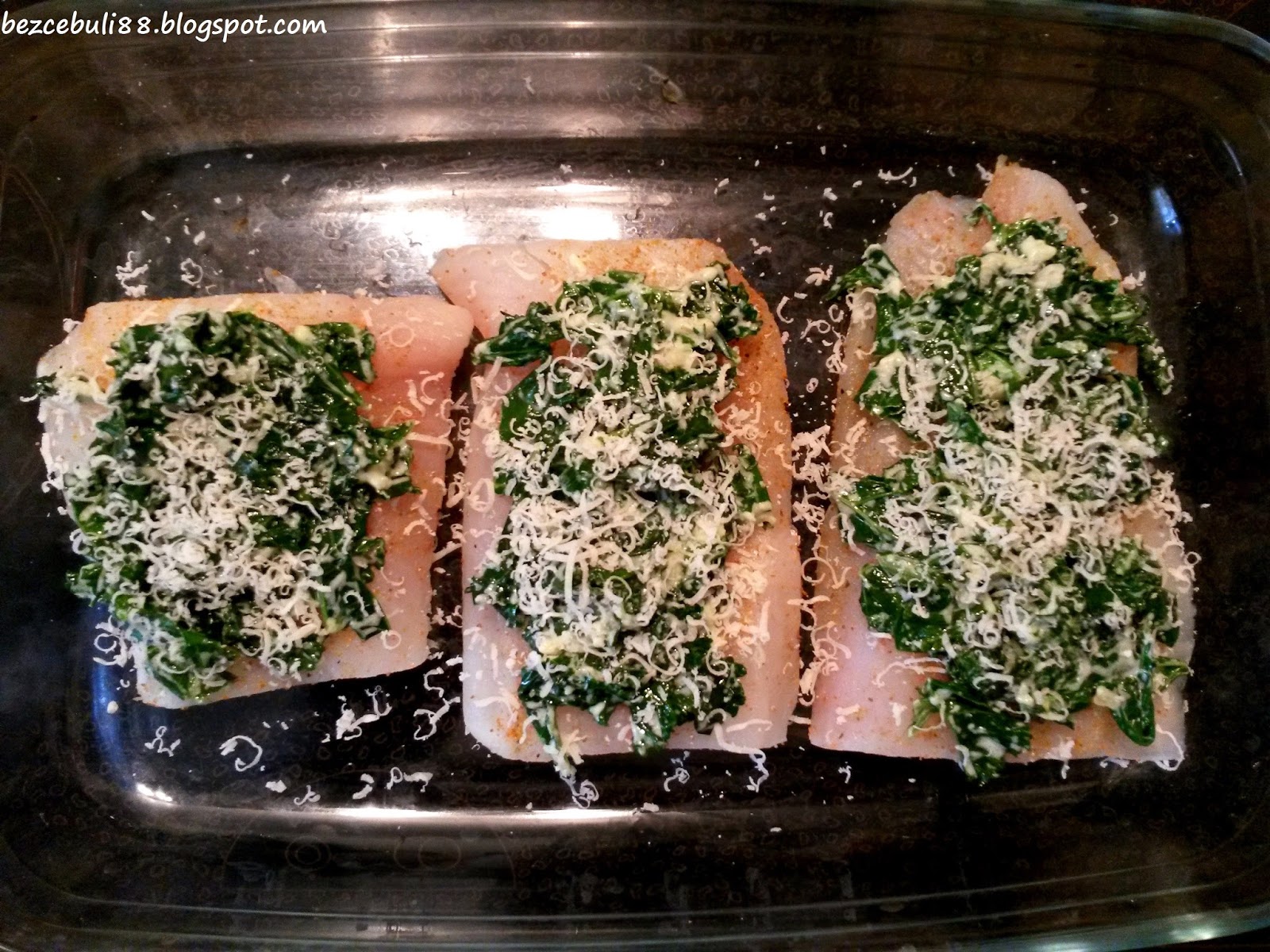 5. Filety układamy w naczyniu żaroodpornym, na wierzch układamy porcję jarmużu, a następnie oprószamy parmezanem.