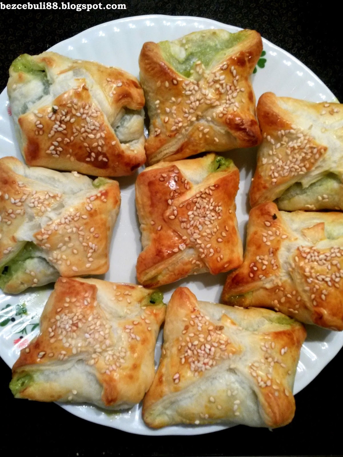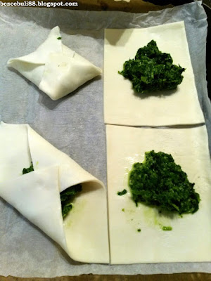 7. Wystudzony farsz przekładamy łyżką na pokrojone ciasto francuskie. Każdy kawałek składamy w kopertę, czubki można dodatkowo docisnąć, aby farsz nie wypłynął podczas pieczenia.