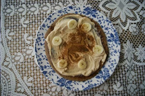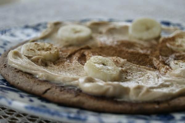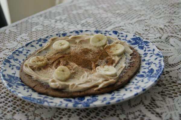Bananowy kakaowy omlet gryczany z miodowo-orzechowym twarożkiem, bananem i cynamonem