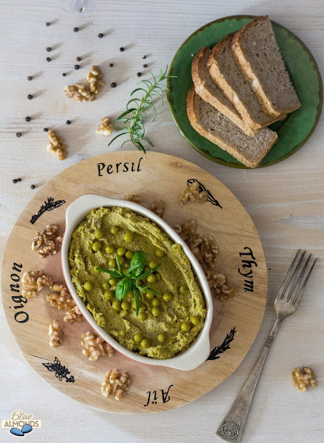 Kremowe smarowidło z kaszy jaglanej, zielonego groszku, orzechów i świeżych ziół. Na dworze zrobiło się lekko wiosennie, więc czemu nie miałoby się też zrobić tak na talerzu :)