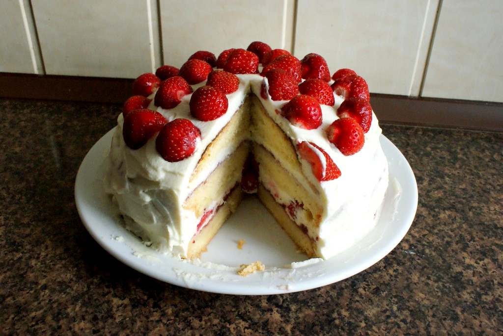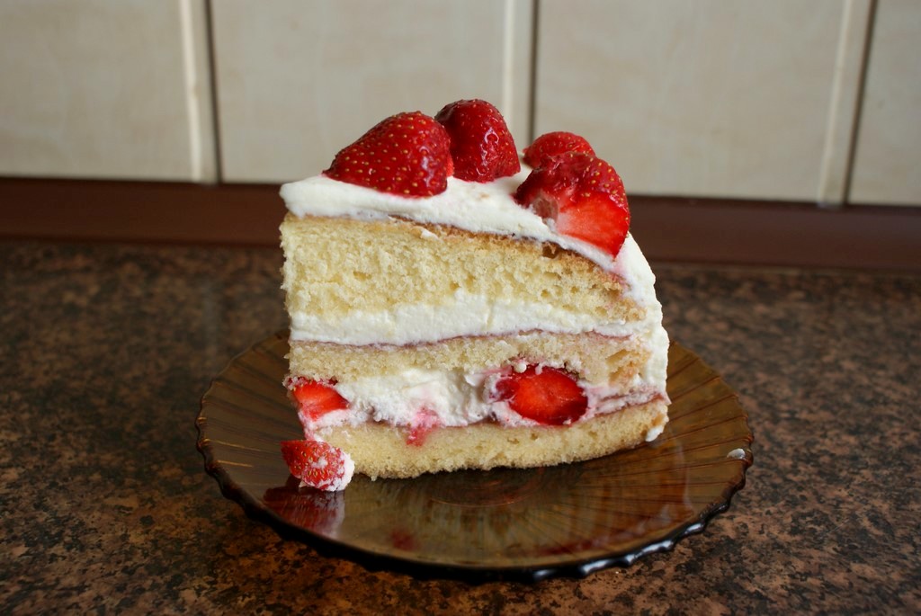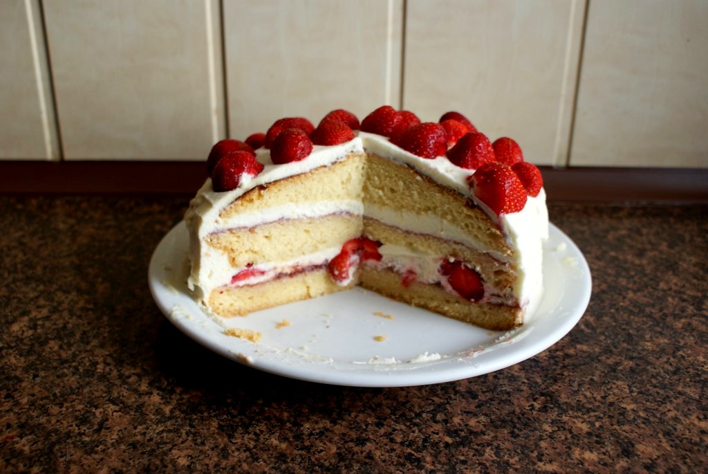 Tort śmietankowy z truskawkamiSkładniki:Biszkopt: 4 jajka