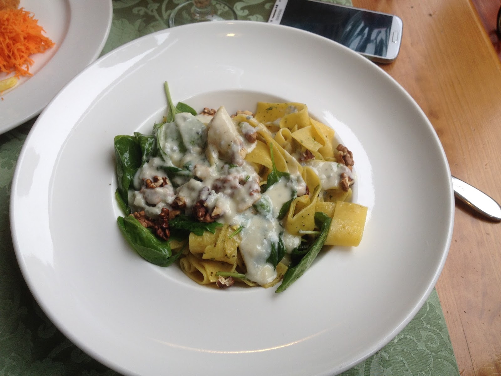 Cóż nasza wegetarianka, trafiła najlepiej... Bo sos był smaczny, nie był zbyt gorzki. Makaron chyba własnego wyrobu był ugotowany w punkt, a szpinak dobrze dopełniał resztę. Zdecydowanie to było najlepsze danie tego dnia!